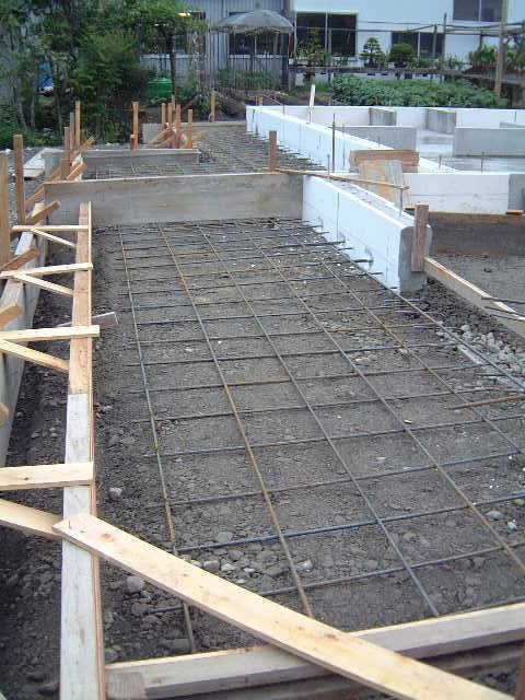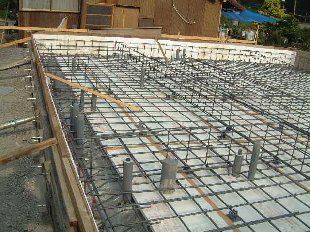 | 6月3日(火)快晴 今日も暑かった 今日、明日の予定で吉川組さんによる基礎配筋作業である。 テキパキと断熱材貼り、鉄筋の曲げや組立てをされていたさすがにプロである。 |