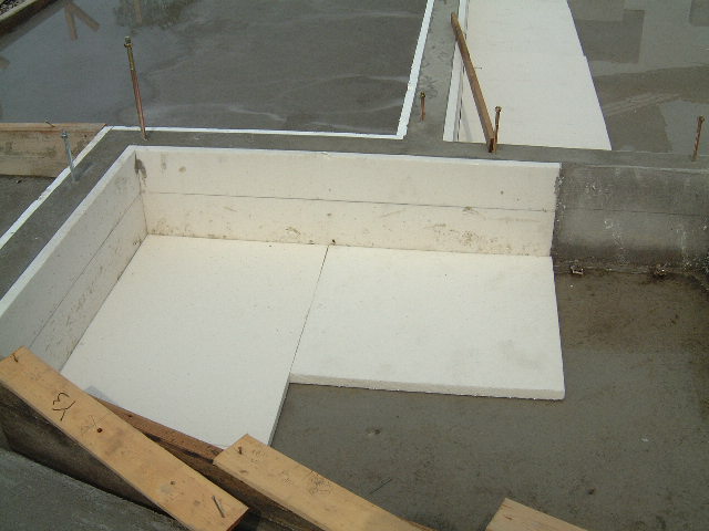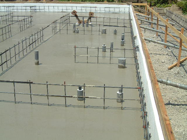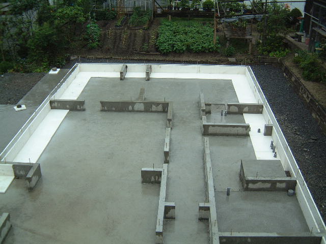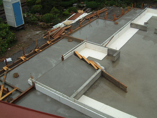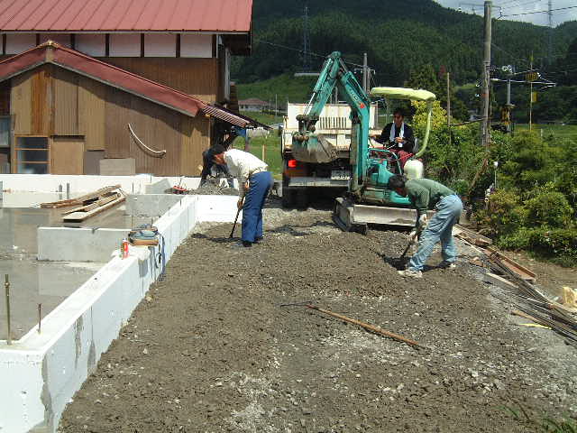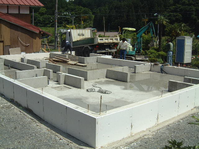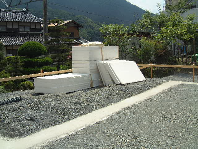 | 6月16日(月)曇り時々晴れ 今日はプレカット工場見学のため留守にして15:00ごろ帰ってきたら打設は終わっていた。吉川組のMさんが仕上げの断熱材を内部ベタ基礎面に張る作業をされていた。数日後に型枠を外せば基礎工事はほぼ完了である。 |