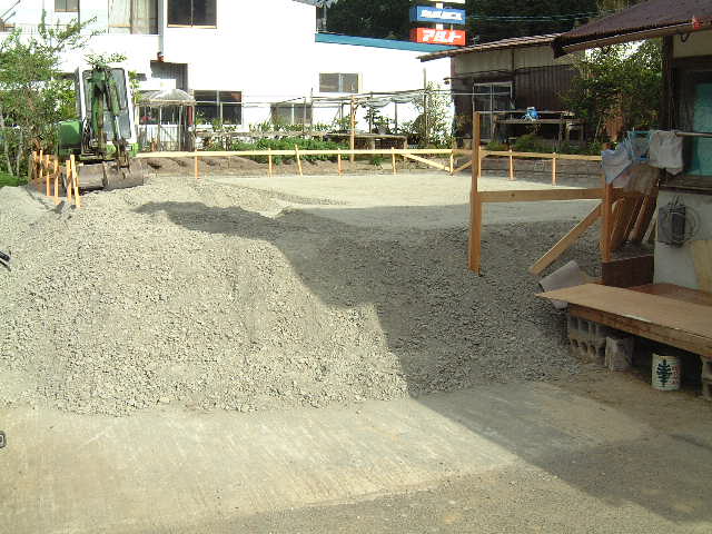 | 5月29日(木)快晴 暑いが風が強いので爽やか 今日から基礎工事、朝5時過ぎには吉川組さんの重機が運搬されて来ていた。吉川組の専務井坂さんが運ばれたらしいが私はまだ夢の中であった。旧敷地から60cm程かさ上げしているので掘り方は少ない。なるめる程度である。 |