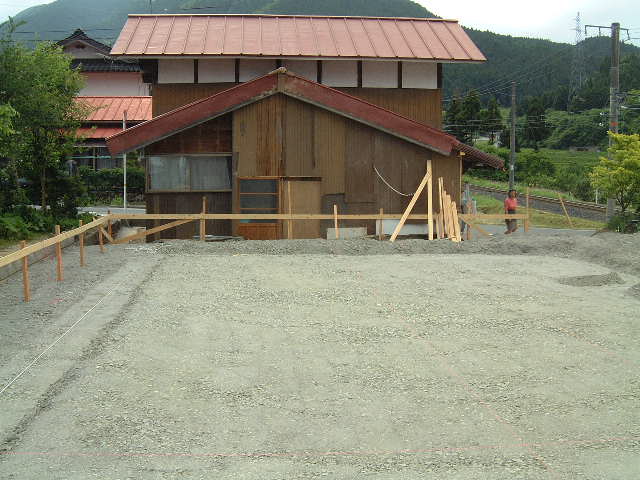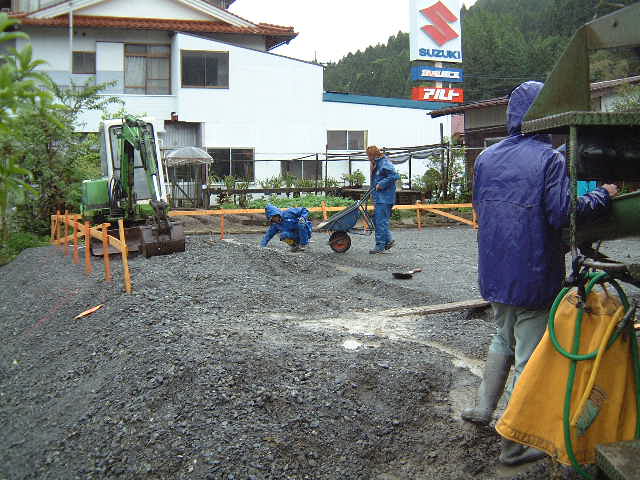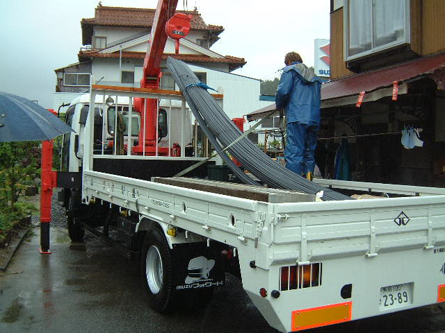 | 5月31日(土)雨 台風4号が5月としては20数年ぶりの上陸ということで昨夜来の雨がおさまらず午後一番で捨てコンを打つ時には大雨になったが15分程で小降りとなったので「ほっ」とした。基礎工事に使う鉄筋も搬入された。雨の中作業された吉川組のお2人の方お疲れ様でした。 |