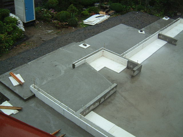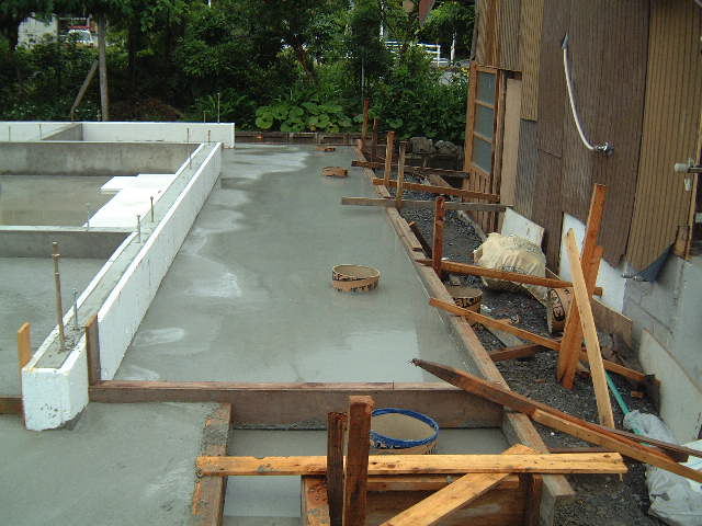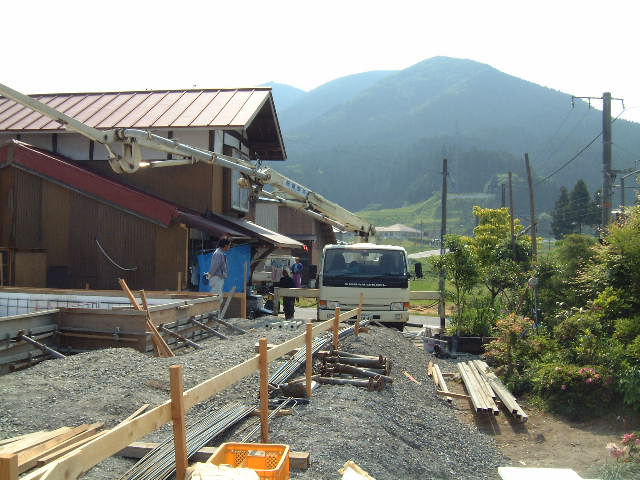 | 6月6日(金)快晴 晴れて良かった 今日は基礎コンクリート流しである。朝9時過ぎにはポンプ車も準備OK、計4台のミキサー車が入り、基礎ベースのコンクリート打ちが11時頃には完了した。慌しい一時だった。少しばかり生コンが残ったので、雨の時に水溜りとなるベンチ前に入れてもらった。 |