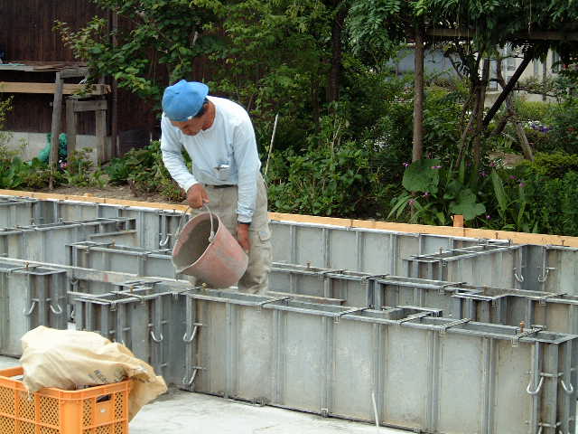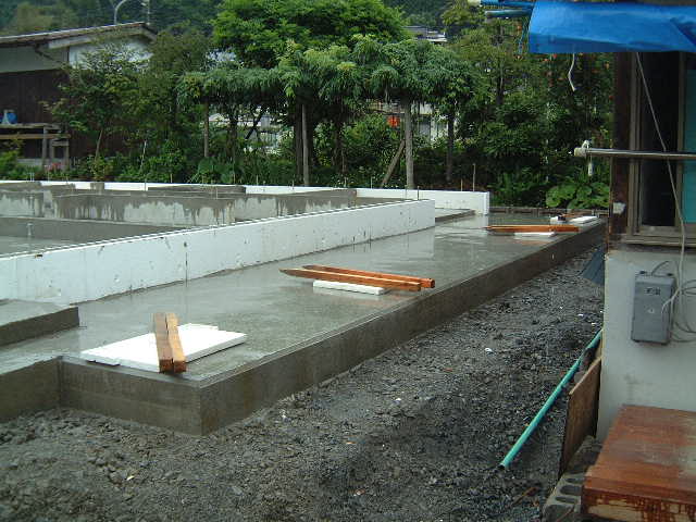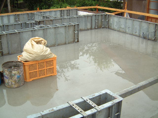 | 6月7日(土)晴れ午後から雷雨 今日は基礎立上り型枠組立てが完了。午前中はよい天気で良かったが1時過ぎから雷雨となり16時ごろまで大雨となった。雨の中頑張って作業をされ雨がやんだころ組立てが終了した。先日ベースコンクリを打った基礎面には一部では水が溜まりていたが水抜きの穴が役立っていたようだ。 |