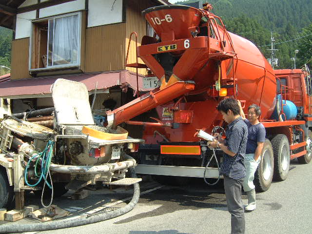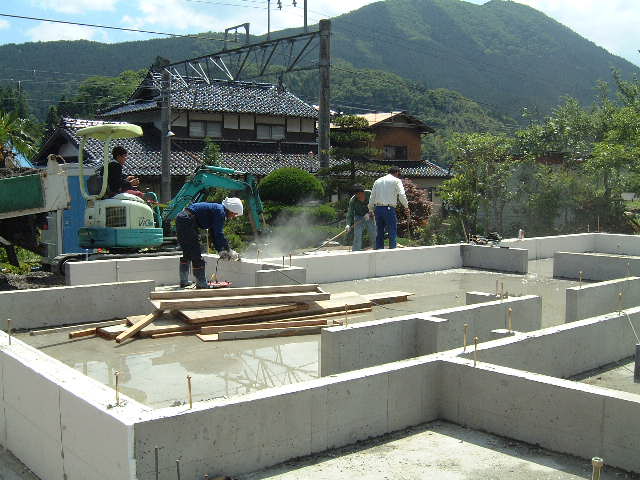 | 6月10日(火)曇り時々薄日 天気予報では朝から雨との事だったが生コン打ちにはまずまずの天気。 今日は基礎立上りのコンクリ打設である。前回の基礎ベース打設の時とは違って打設用ポンプ車は社長さんと奥様?で操作流し込みされた。ホースは重たいしリモコンの操作もあるしなかなか大変そうでした。今回はミキサー車1台で十分あった。やはり余ったので道直し用に利用させてもらった。立上り部分は土台が座るのでレベルをとる事とアンカーボルトを随所に埋め込むため吉川組さん気を使って作業されていた |