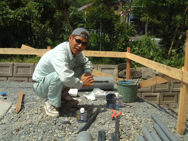 | 6月2日(月)快晴 夏の日差しらしくなってきた 基礎配筋・断熱材敷設前に配管をしておく必要がある。(有)舩原設備工業のAさんが蔵本さんと昼食中までも温水器や洗濯機の配管経路の詰め話をして、PM7:30ごろまで掛かって仕上げて頂いた。とても丁寧にやっていただきありがたい。また、朝のうちに(株)木建の方が基礎部分に敷く断熱材(スタイロエース30mm厚)を搬入して下さった。 |