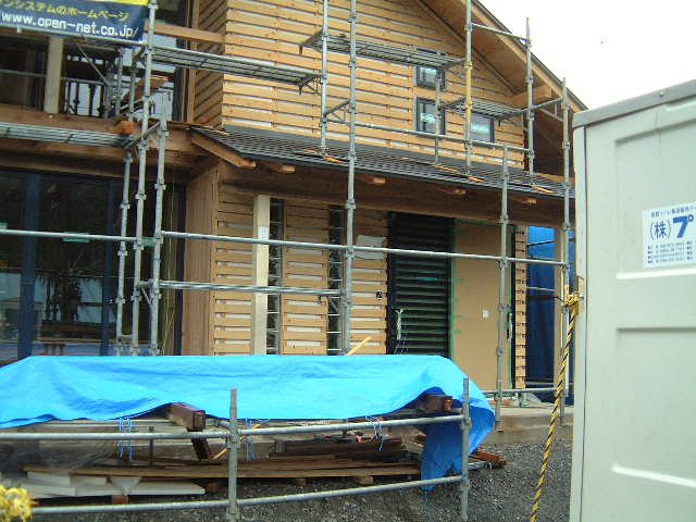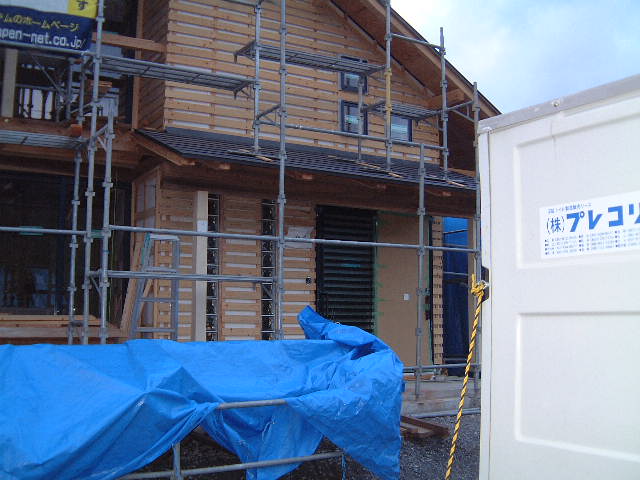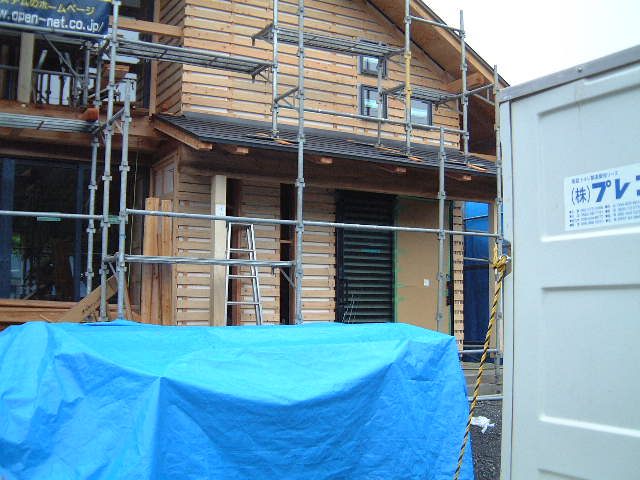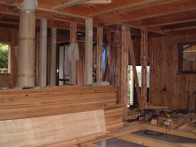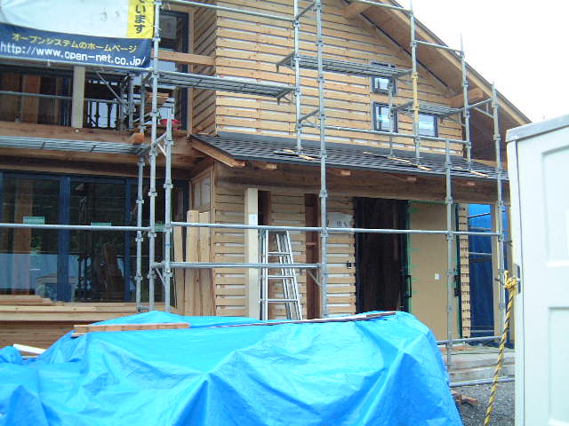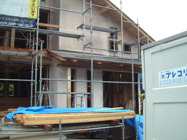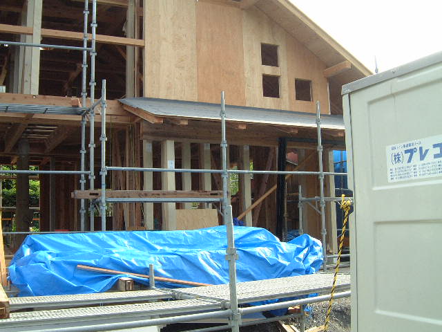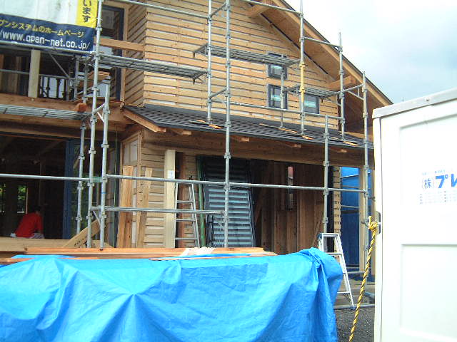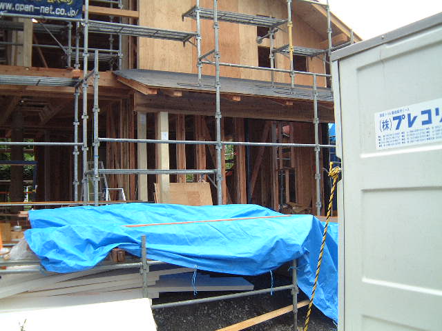 | 7月11日AM7:00 7/8〜10 外壁(野地板貼り)、内装(床、敷居・鴨居等)工事中の状況 | ||