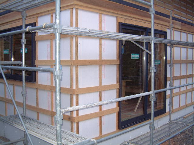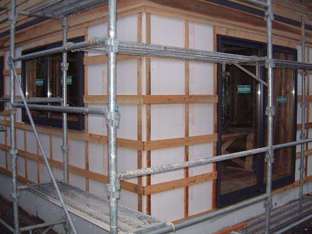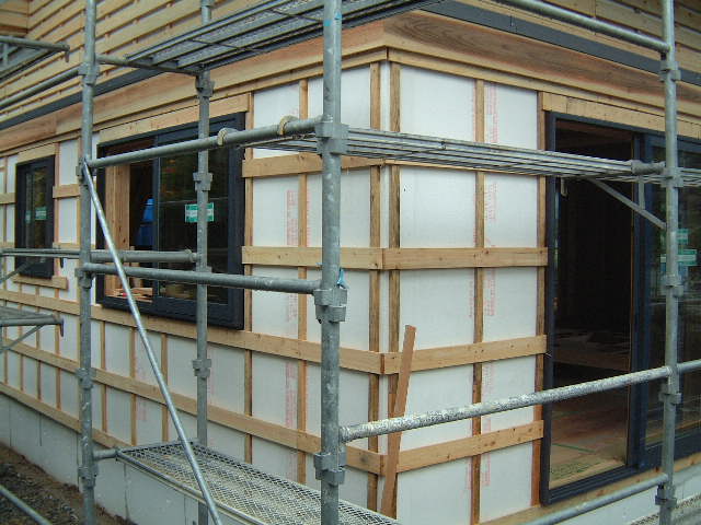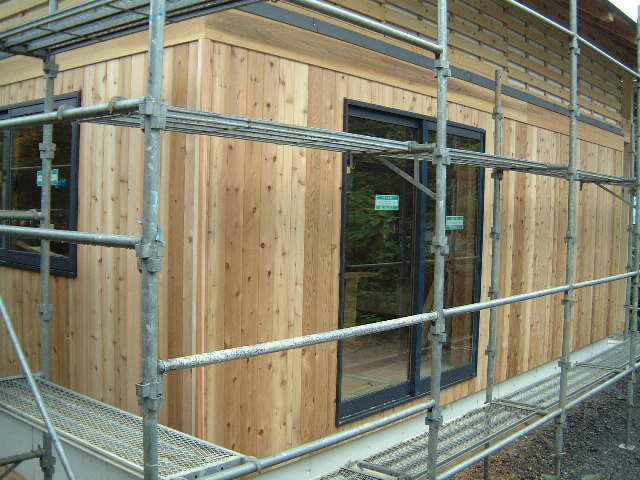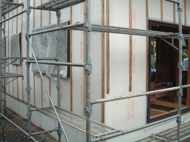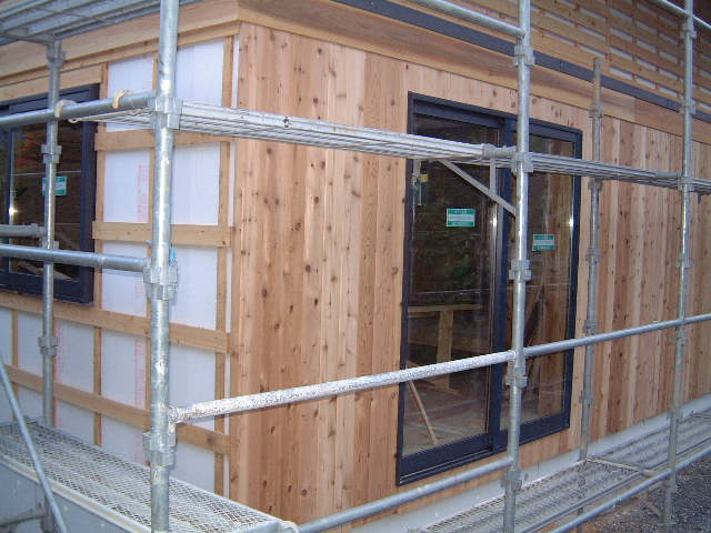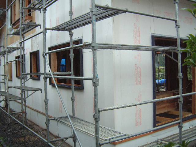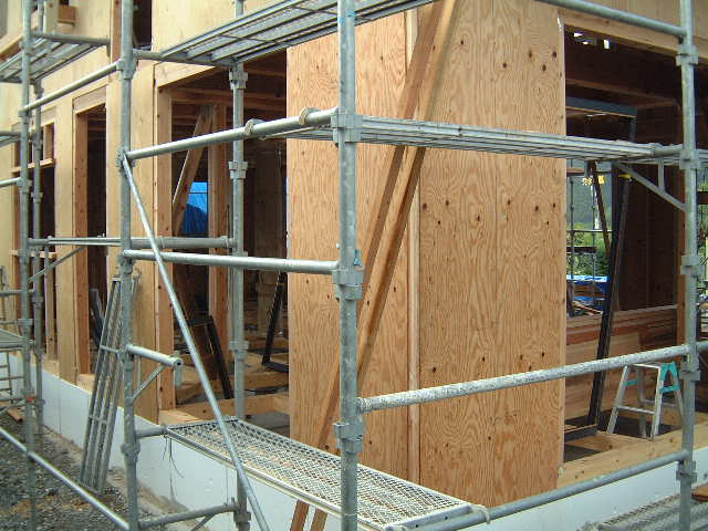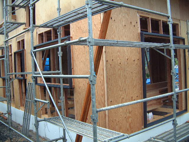 7月3日 PM7:30 7/2 外壁用合板貼り・サッシ取付け作業、仮設足場手直し後の状況 |